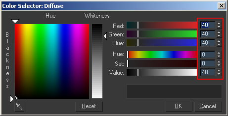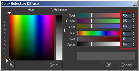-Select the Diffuse color and set it to a range around 86,86,86