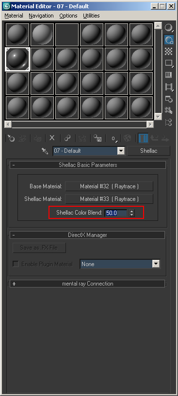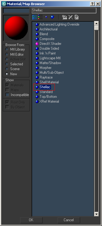 1) We will start by selecting a standard material ball from your material editor. We want to switch this material to a Shellac material by clicking the Standard button.
