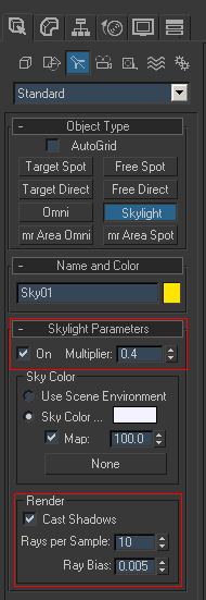 8) Add a Skylight to your scene with the following properties. Set the multiplier to 0.4 and the shadows to 10 Rays per Sample.
