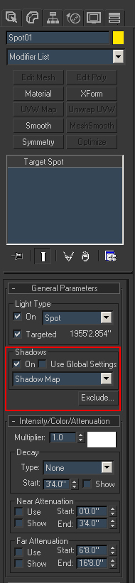 7) Add a standard Spotlight to your scene with the following properties. The only thing that I have added was turning Shadows On.